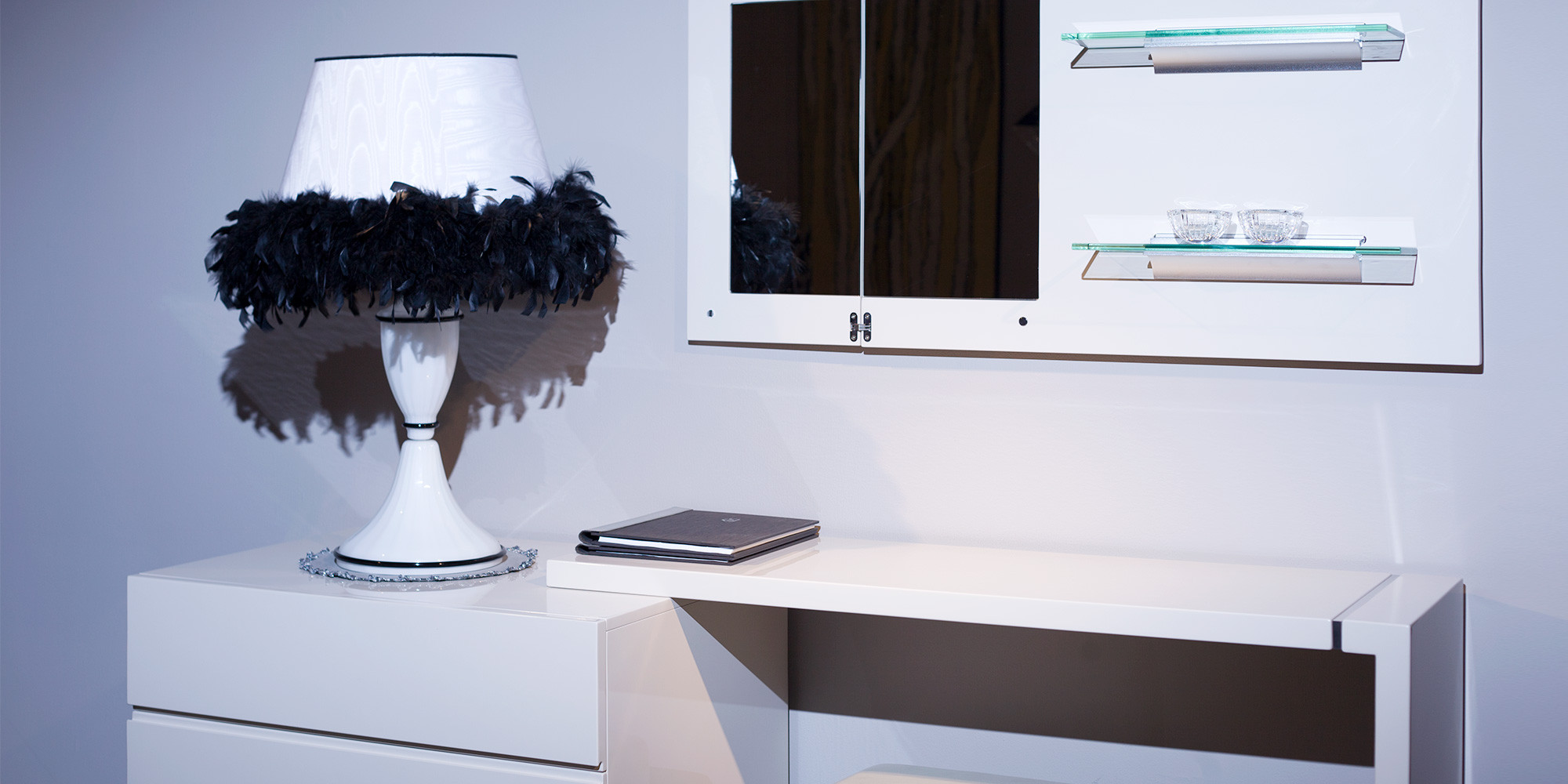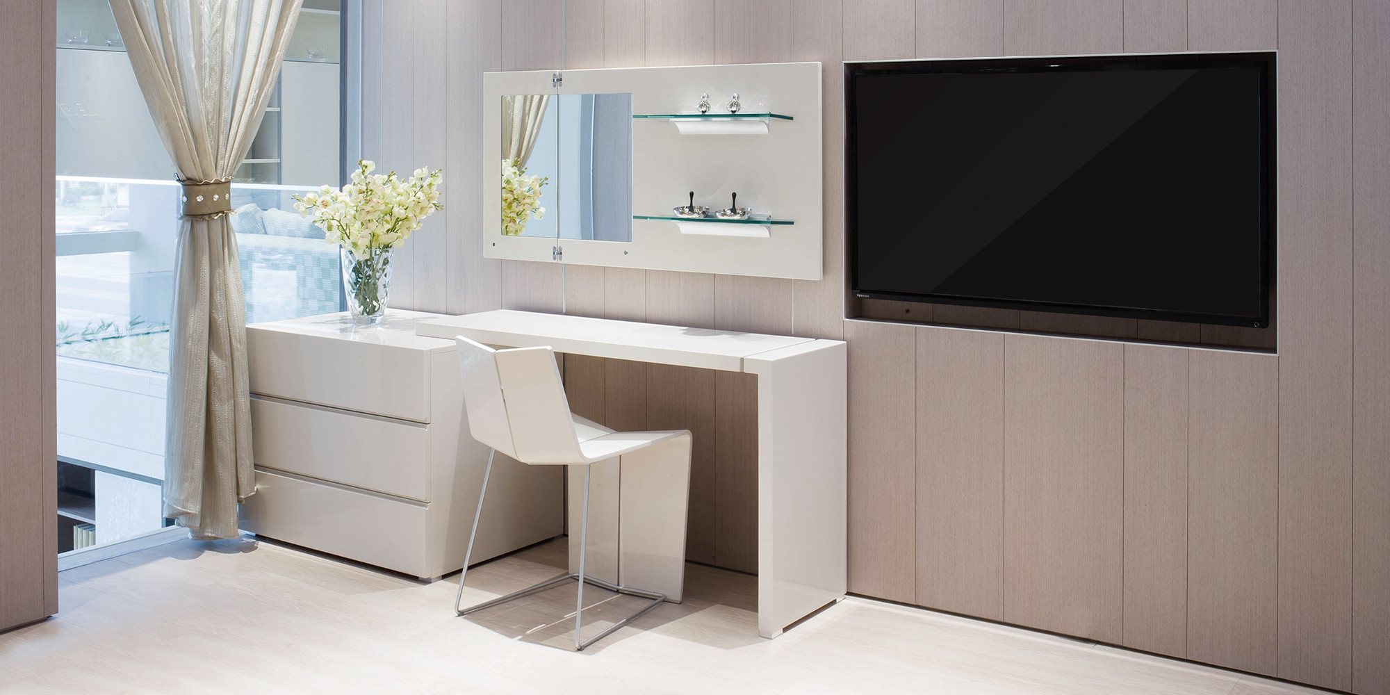 妆台面可选择亮光面或胡桃木面;亮光面经3层UV底漆和2层意大利PU亮光面漆喷涂处理,羊毛球高速抛光;胡桃木面经意大利水性透明漆(或亚加力透明底漆及面漆)喷涂处理