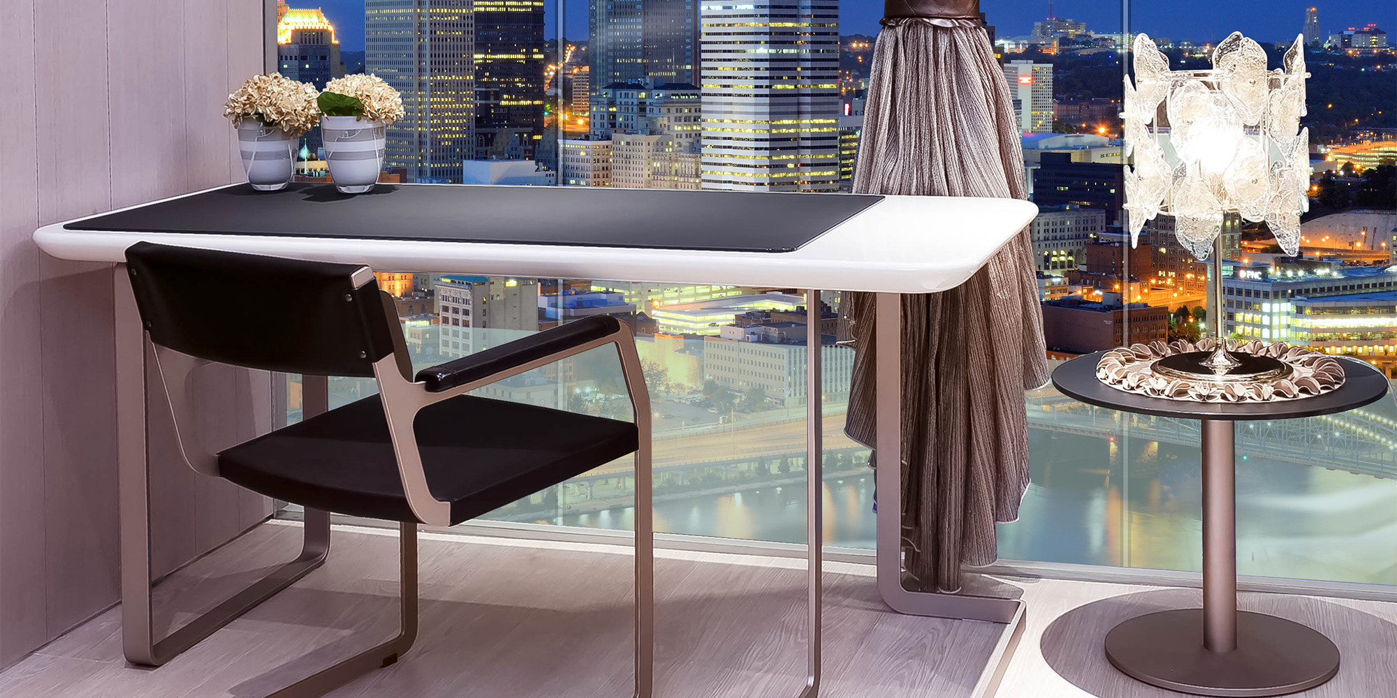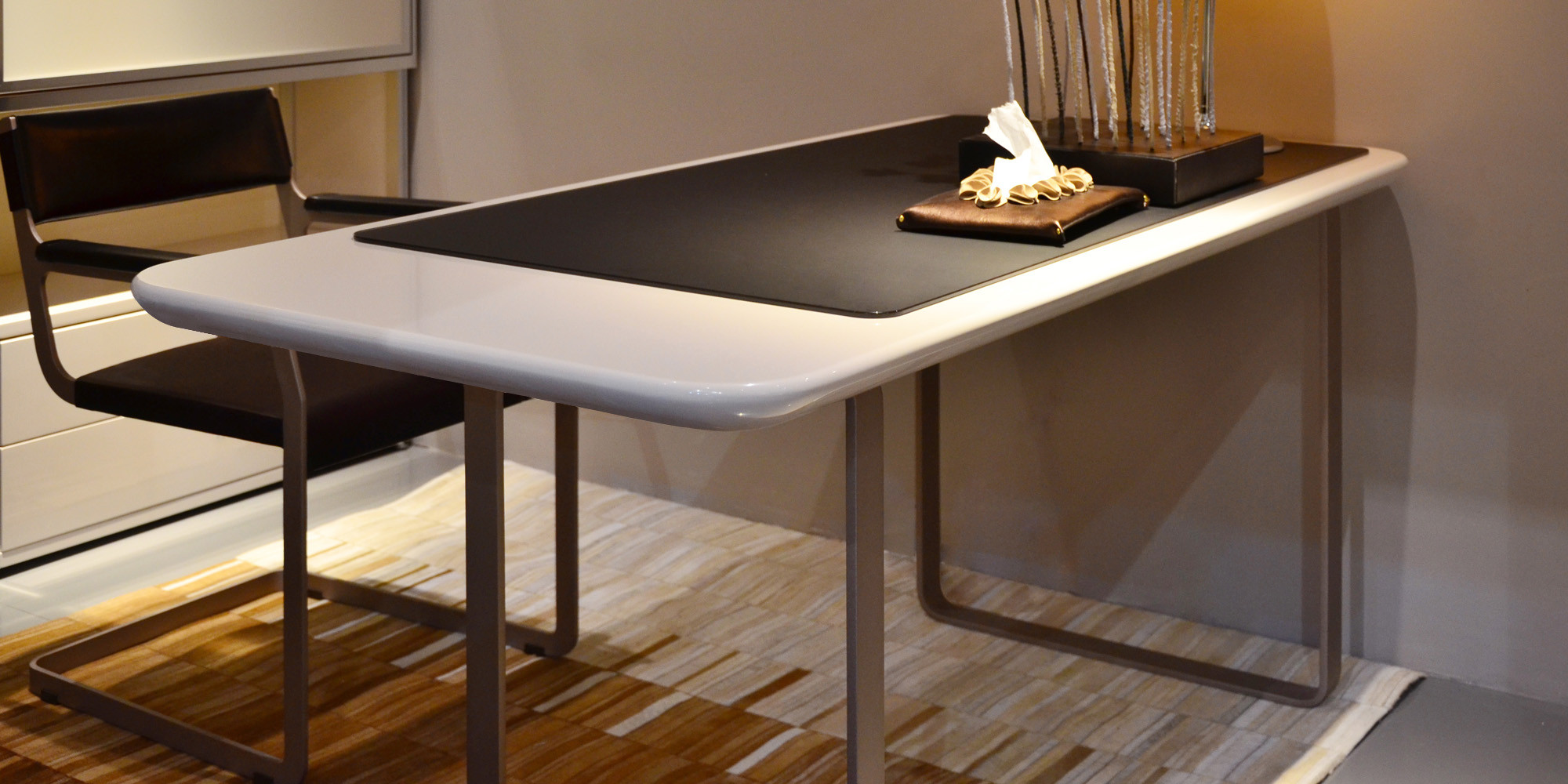 台面为49mm厚中纤板蜂窝芯,经3层UV底漆和2层意大利PU面漆喷涂处理,羊毛球高速抛光,5mm厚强化玻璃经雾化处理,有多款颜色可选