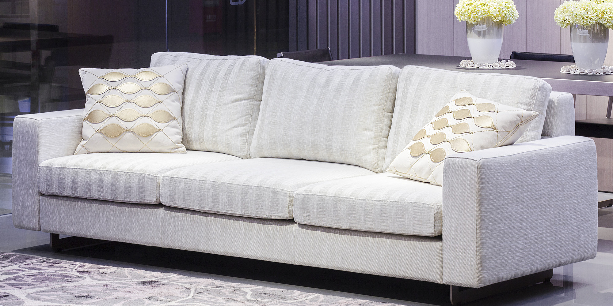 沙发靠垫内的填充物为人造羽绒,可避免人体对羽绒敏感