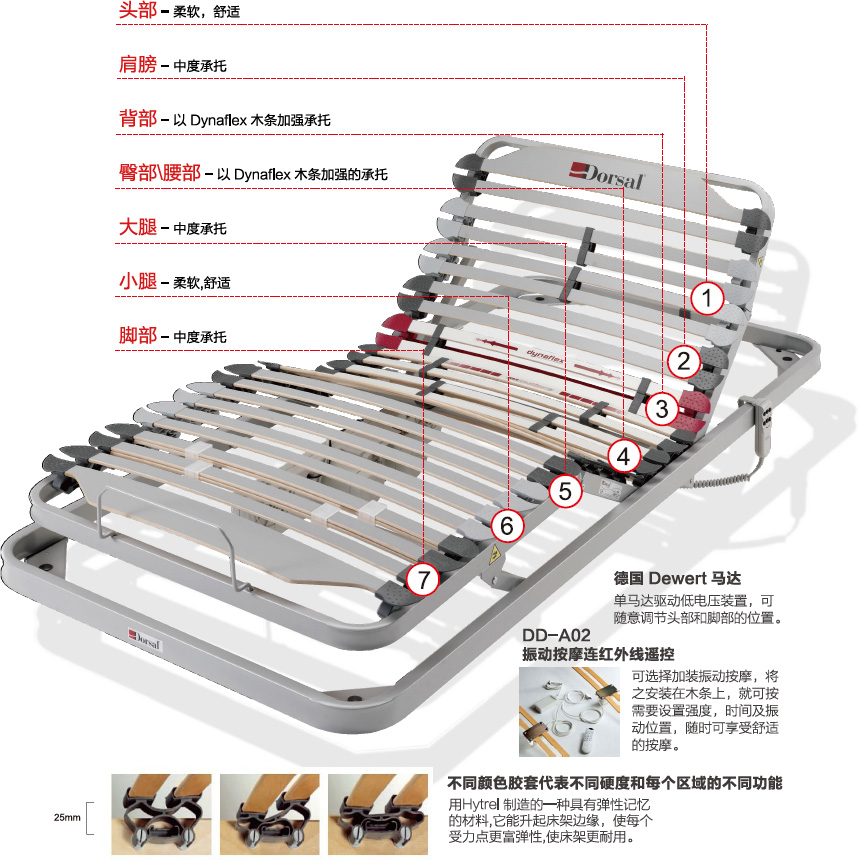 - 根据人体工程学,床架分为七大受力区域,浅灰色胶套最为柔软,灰色硬度适中,红色较硬为加强承托区域,针对人体不同部位提供有效支撑