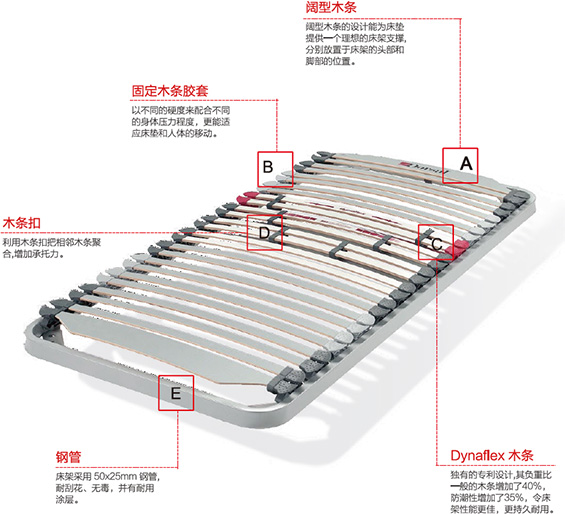 Dynaflex专利设计通过最具认证及授权性的德国实验室的测试与监控W.Klauditz--Institut Frauenhofer and the Tuv.Sudwest,证实Dynaflex木条能给予床架最好的支撑,实验证明能增强整条木条的弹性。