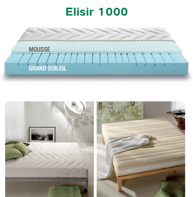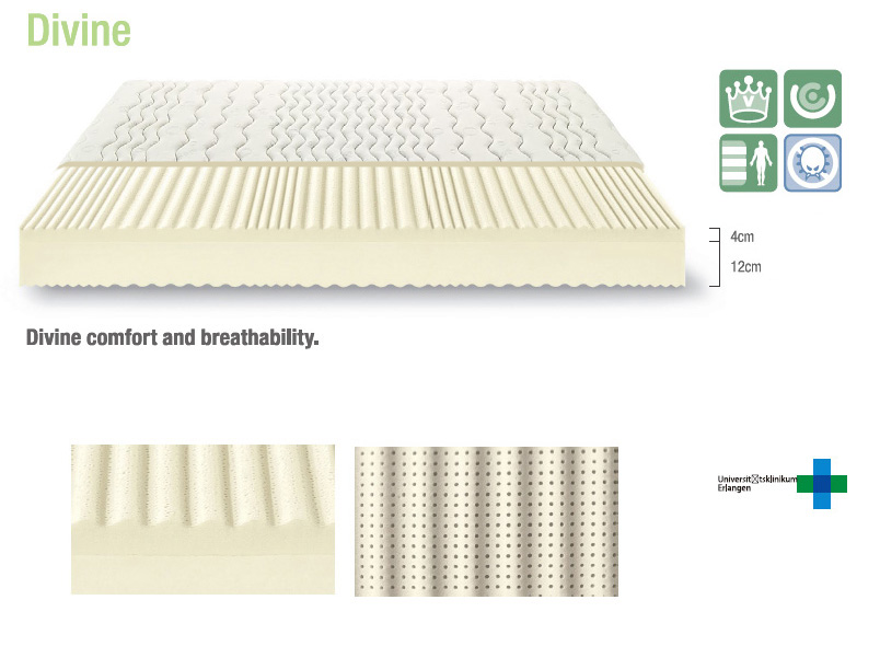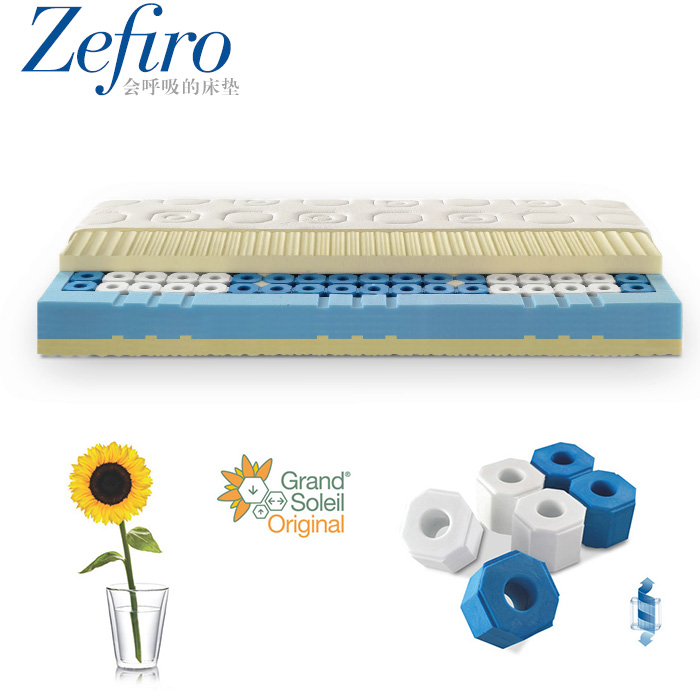 - 由三层不同海绵组成,原料采用葵花籽油和水制造的天然Grand Soleil海绵,根据人体工程学,每层采用不同种类的海绵及通过不同切割方式,将床垫分为七大舒适区域,为身体不同部位提供适中承托力